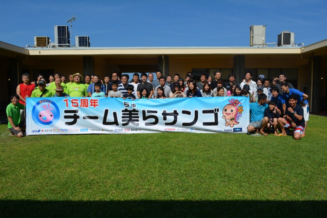 チーム美らサンゴ15周年横断幕 恩納村「サンゴの村宣言」キャラクターのSannaちゃんも登場!